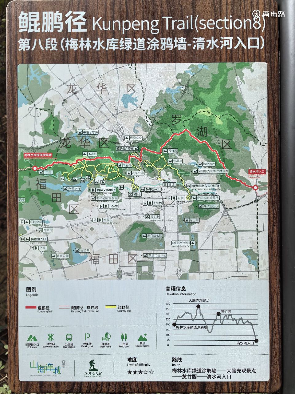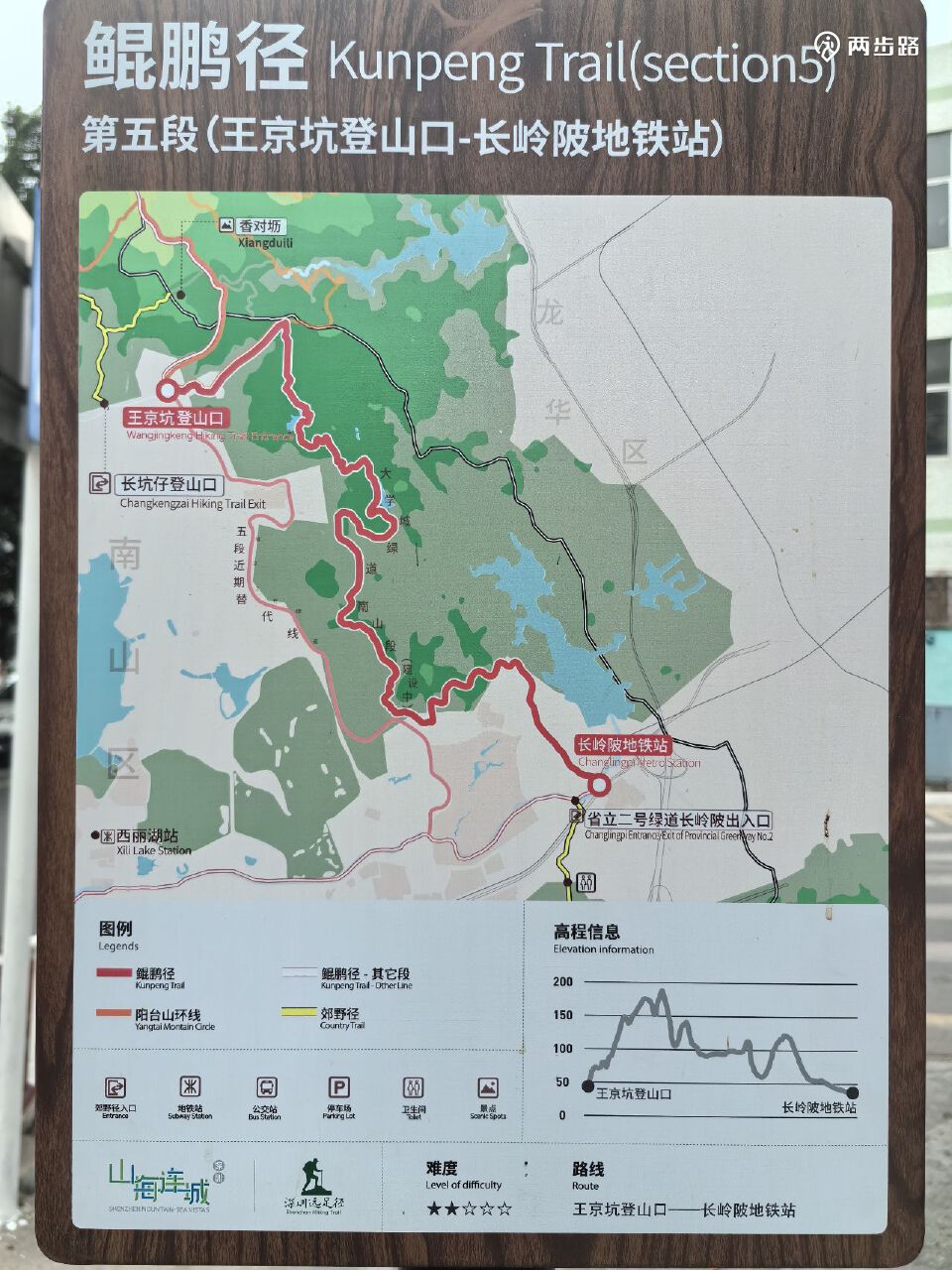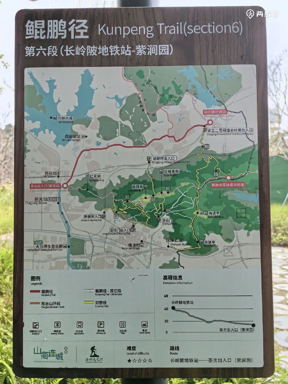 5.鲲鹏径5段(爬山为主,未通):12公里,王京坑登山口-长岭陂地铁站A口附近,YK073-YK093。目前只能走替代线。替代线耗时约2.5小时。