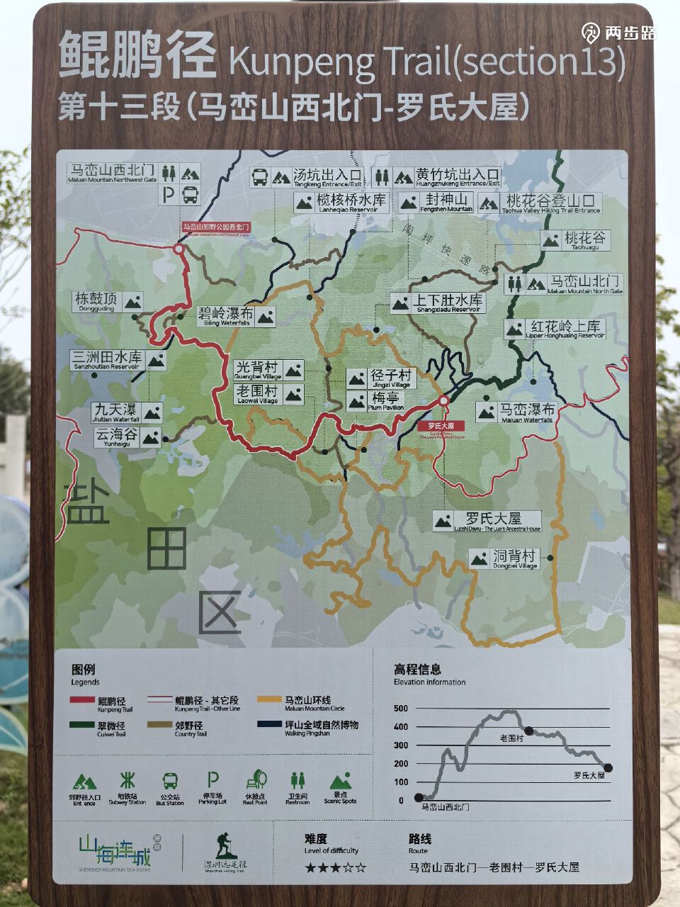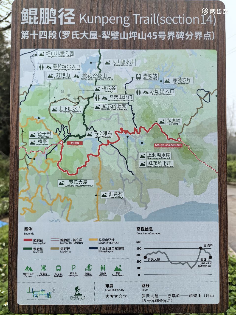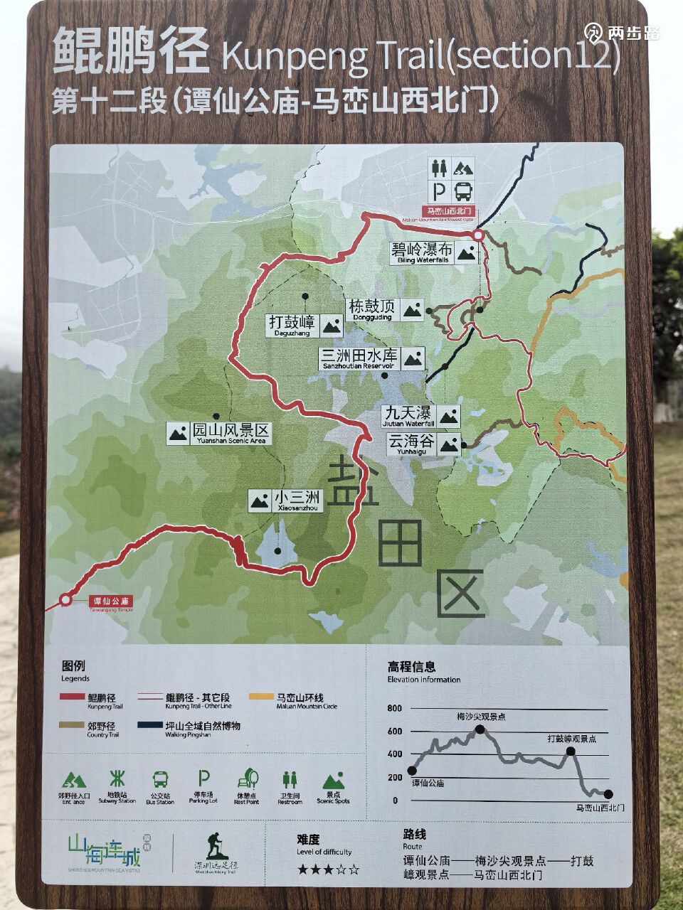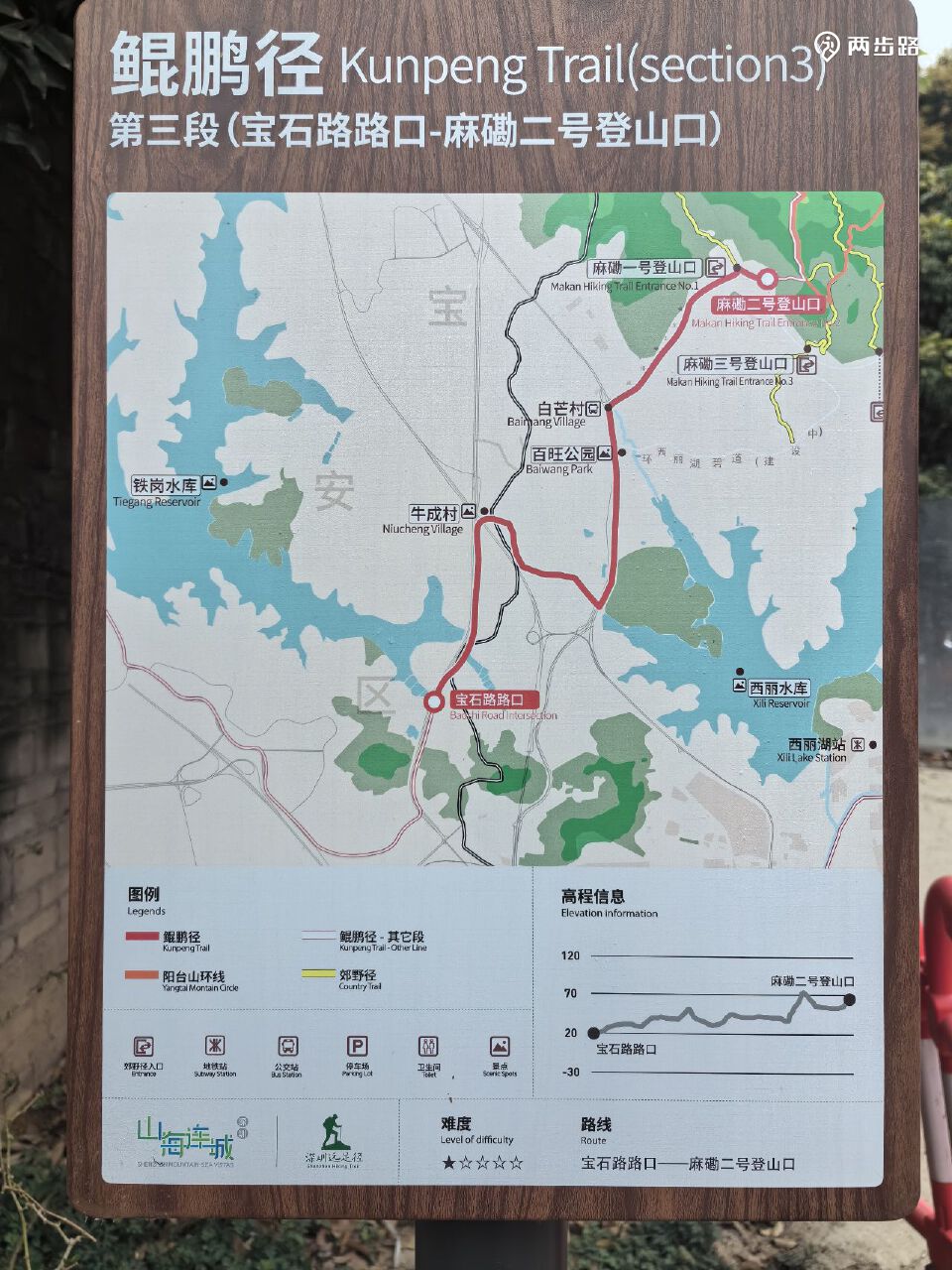 5.鲲鹏径5段(爬山为主,未通):12公里,王京坑登山口-长岭陂地铁站A口附近,YK073-YK093。目前只能走替代线。替代线耗时约2.5小时。