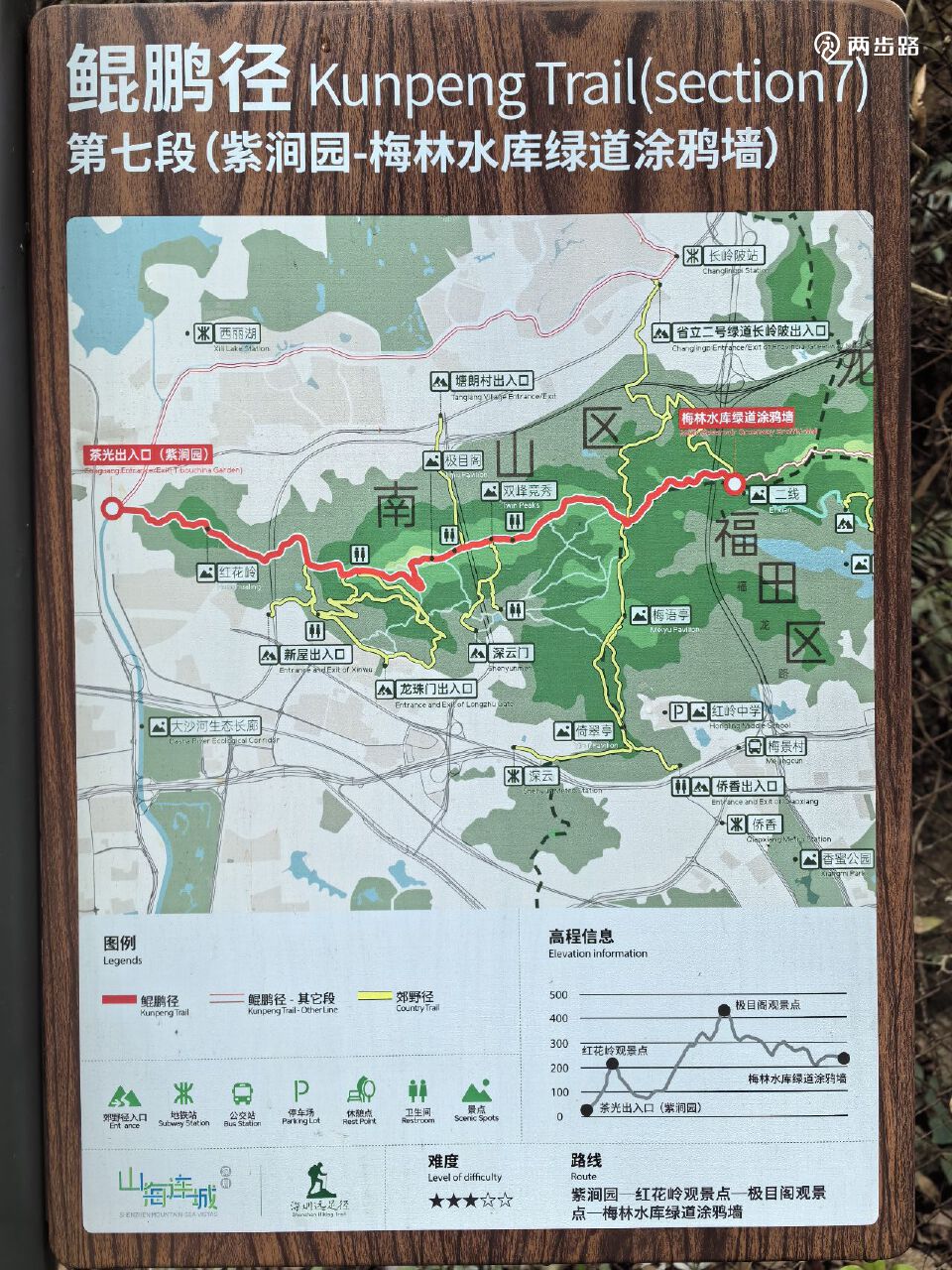 7.鲲鹏径7段(爬塘朗山):8.5公里,紫涧园-梅林水库涂鸦墙,YK109-YK124。耗时约2.5小时。