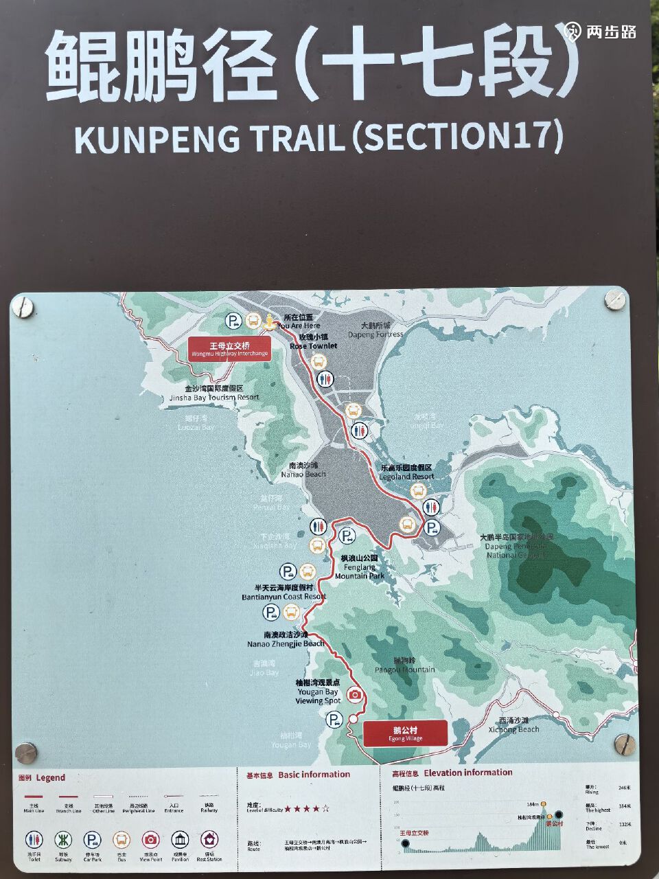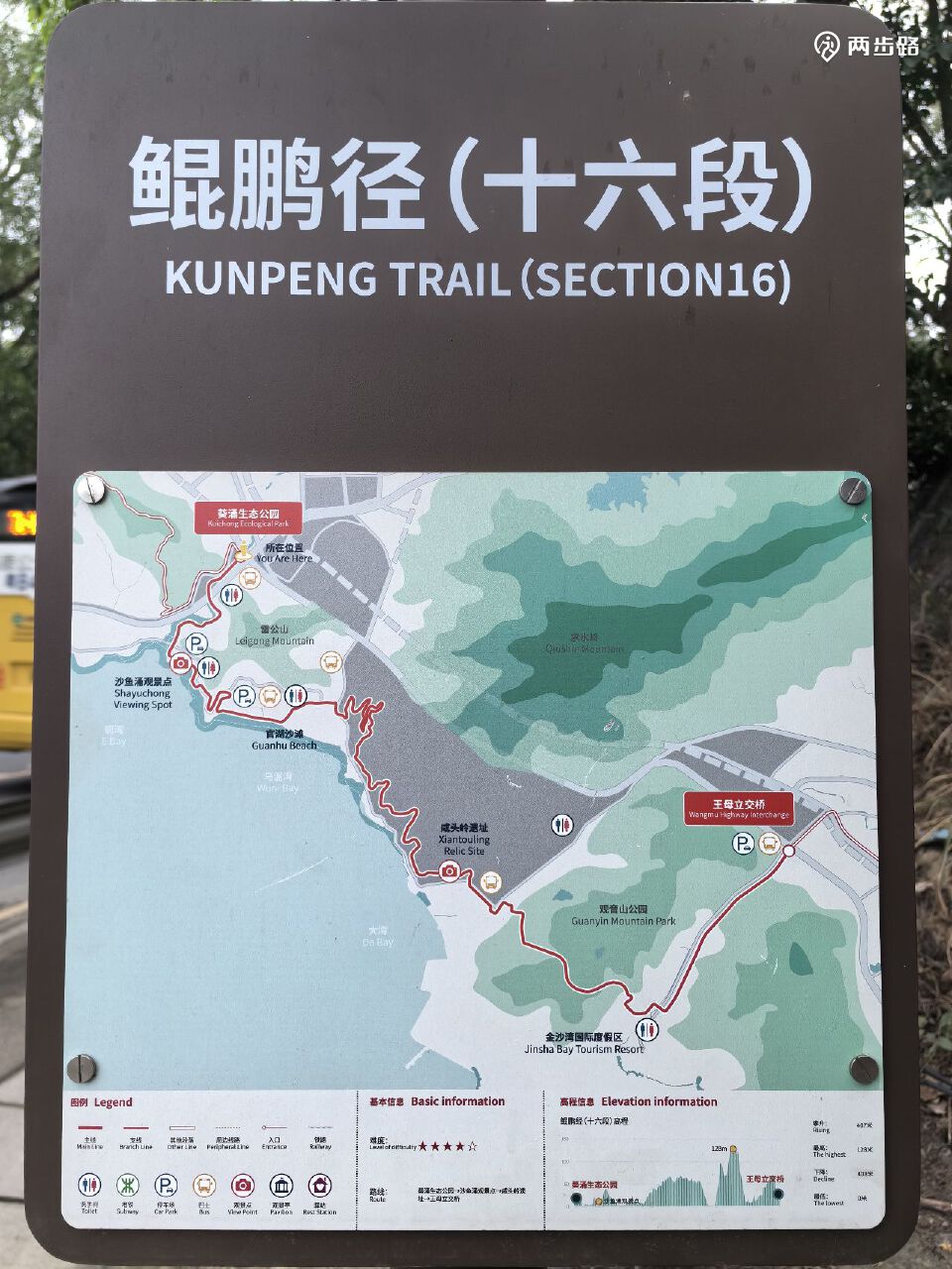 16.鲲鹏径16段(海边、爬山及城市道路):15公里,深葵路南端的葵涌生态公园-观音山公园主入口或王母立交桥,道路基本上是原来的绿道,郊野径有2公里多(咸头岭、观音山),YK311-YK339。YK316附近有锁,需要绕路。耗时约3小时。