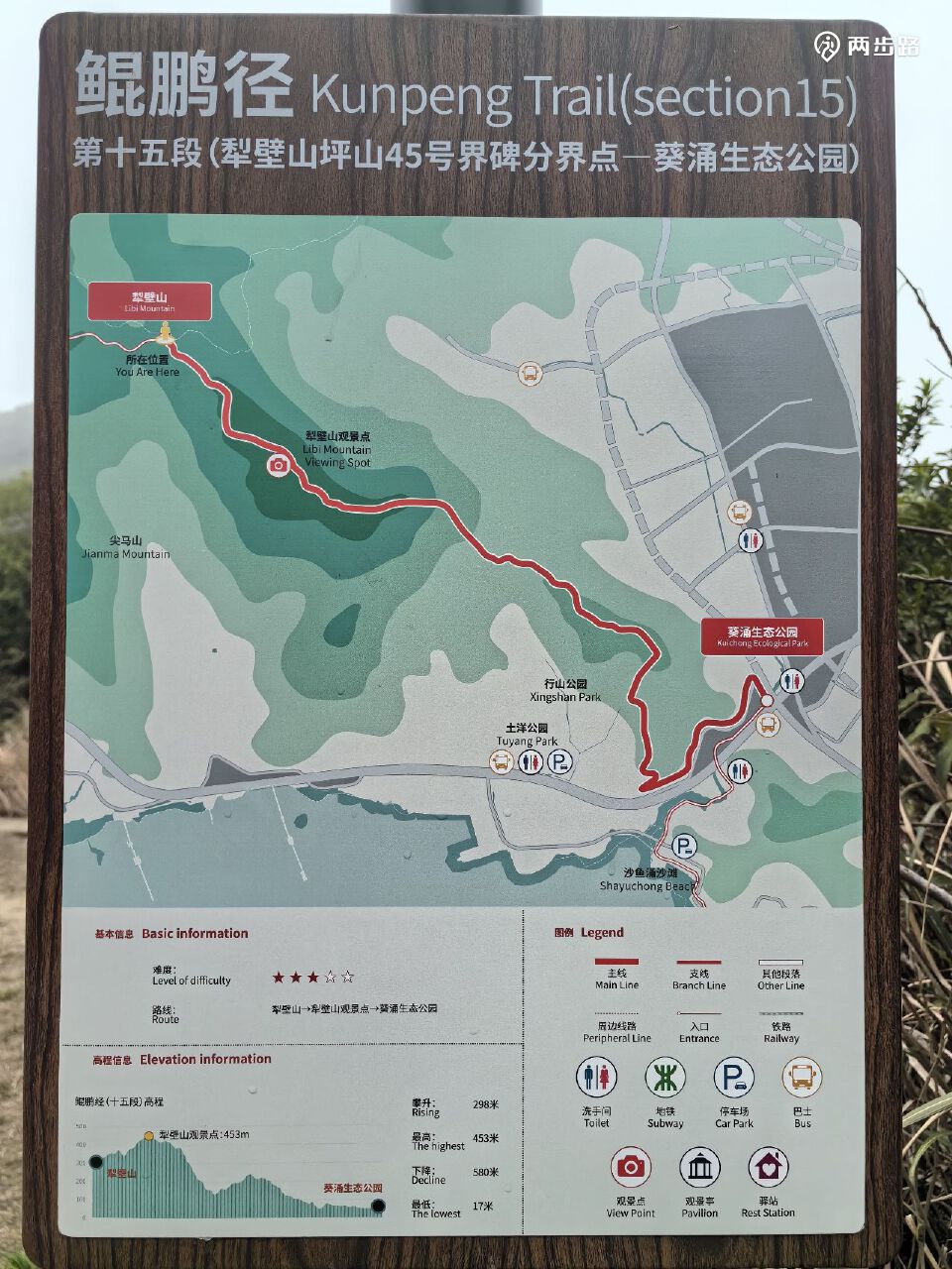 15.鲲鹏径15段(爬犁壁山、行山):7.5公里,起点在山上,终点葵涌街道(马路边),YK297-YK311。耗时约2.5小时。