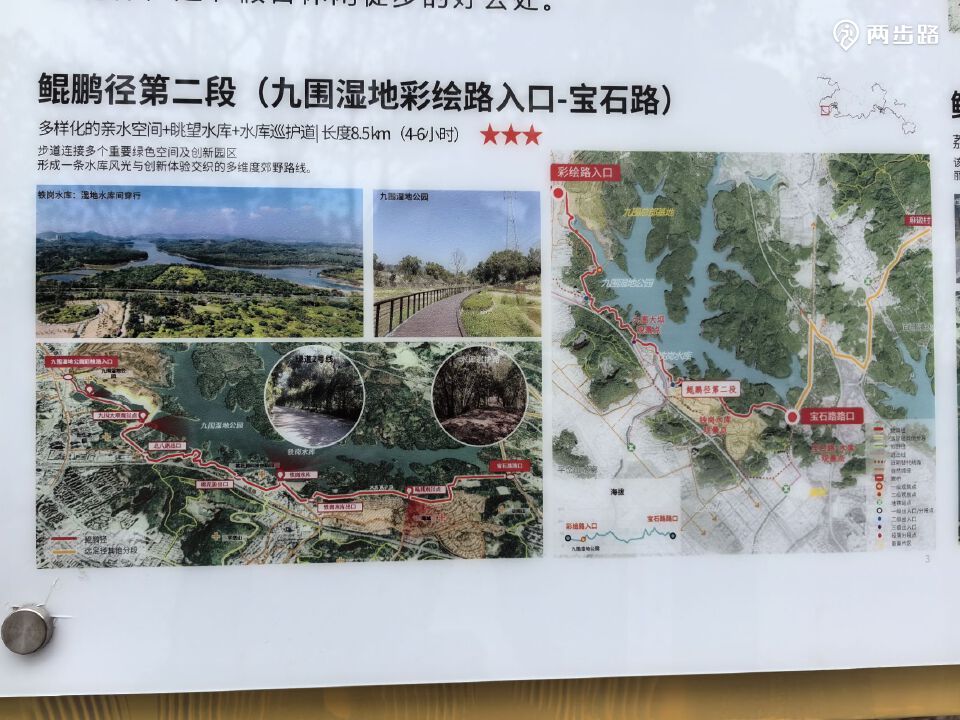 2.鲲鹏径2段(九围湿地公园):8.5公里,九围湿地彩绘路入口-宝石路路口,还没有修通,只能走替代线(城市道路)。替代线耗时约2.5小时。